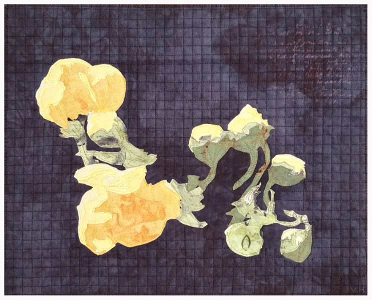 Allium #2, 51 cm x 38 cm är också inspirerad av ett foto som jag har tagit. På en promenad i botaniska trädgården såg jag en mycket hög och märklig planta med beteckning Allium. Toppen hade en lång snabelliknande utväxt och löken liknade vitlök med ett tunt vitt lökskal. Den hade nyligen börjat öppna sig och visa insidan med en liten lök. Senare lärde jag mig att den heter Egyptian walking onion (Alium xprofilerum) och sprider sig genom att den mogna plantan tappar sina smålökar i jorden. Collage av handfärgade och kommersiella tyger av linne, bomull och siden, frihandkviltat på maskin. Handbroderier.